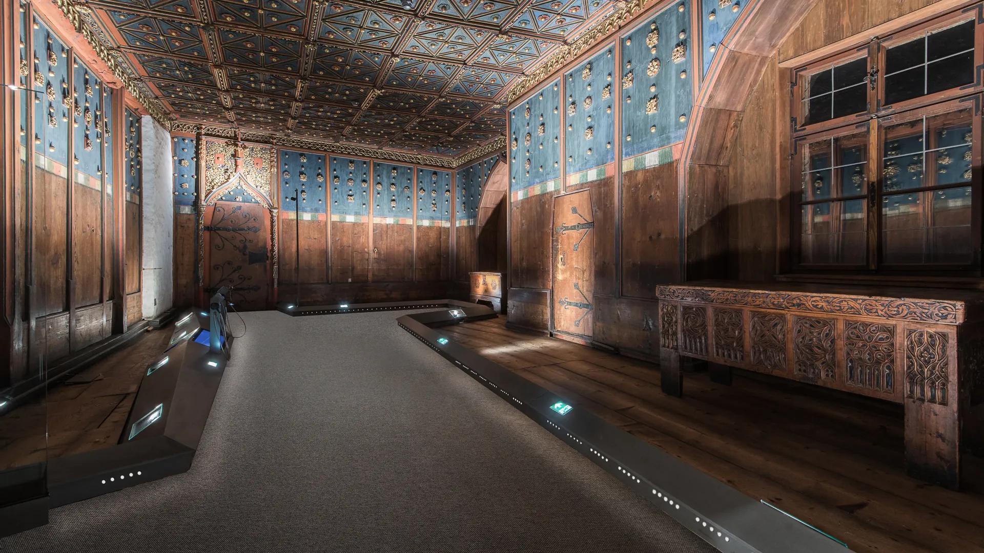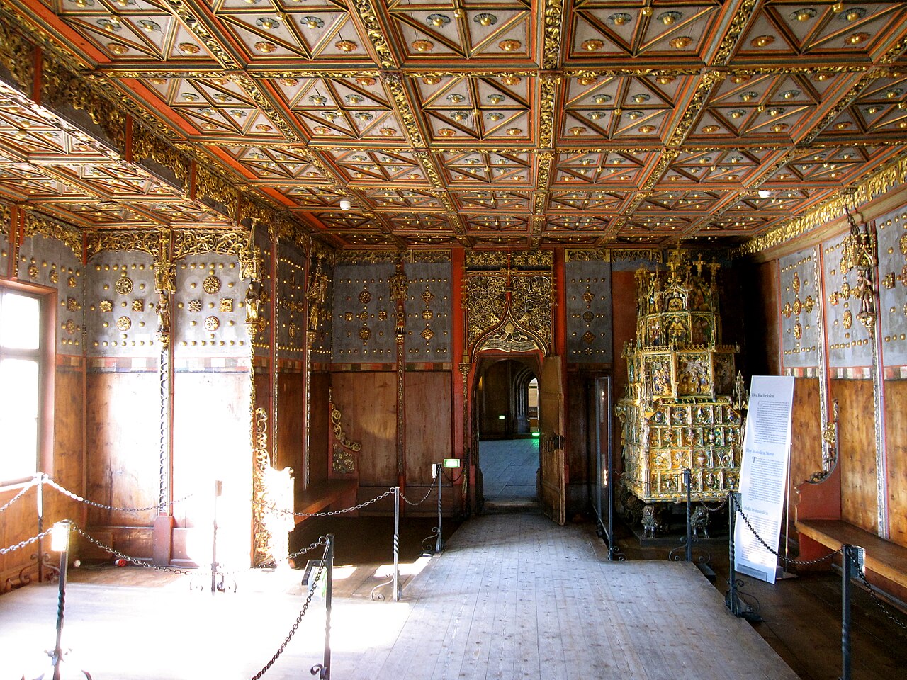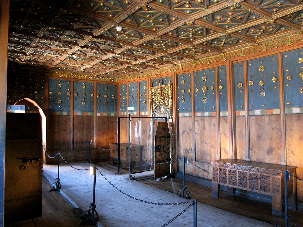 - سالن طلایی (Golden Hall): این سالن با تزئینات چوبی حکاکیشده و نقاشیهای دیواری، یکی از زیباترین بخشهای قلعه است.