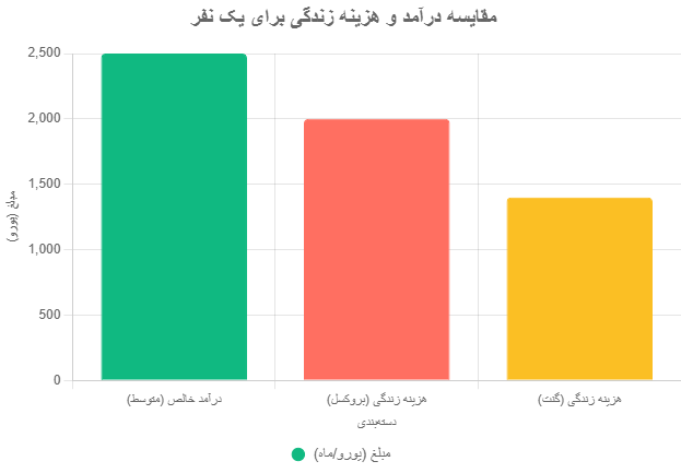 - کار پارهوقت: ۲۰ ساعت/هفته (۱۲-۱۵ یورو/ساعت) ≈ ۴۸۰-۶۰۰ یورو/ماه.