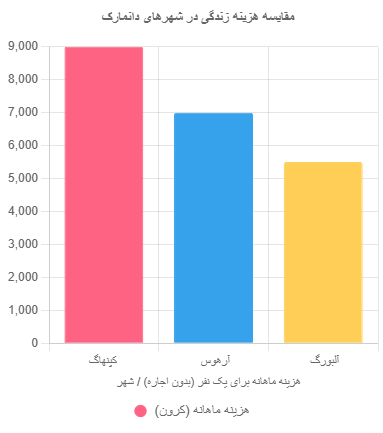 - مسکن اشتراکی: اجاره اتاق در آپارتمان اشتراکی در کپنهاگ: ۴,۰۰۰-۷,۰۰۰ کرون.