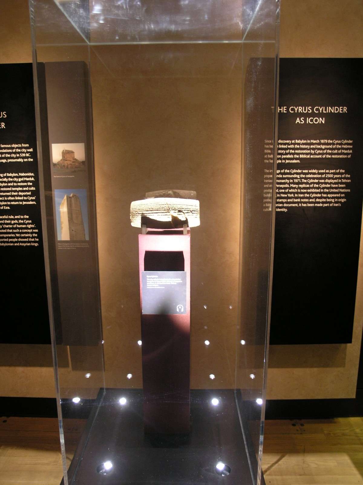 این استوانه گلی از دوره هخامنشی، که بهعنوان یکی از اولین اسناد حقوق بشر شناخته میشود، در اتاق ۵۲ به نمایش گذاشته شده و برای ایرانیان اهمیت ویژهای دارد.