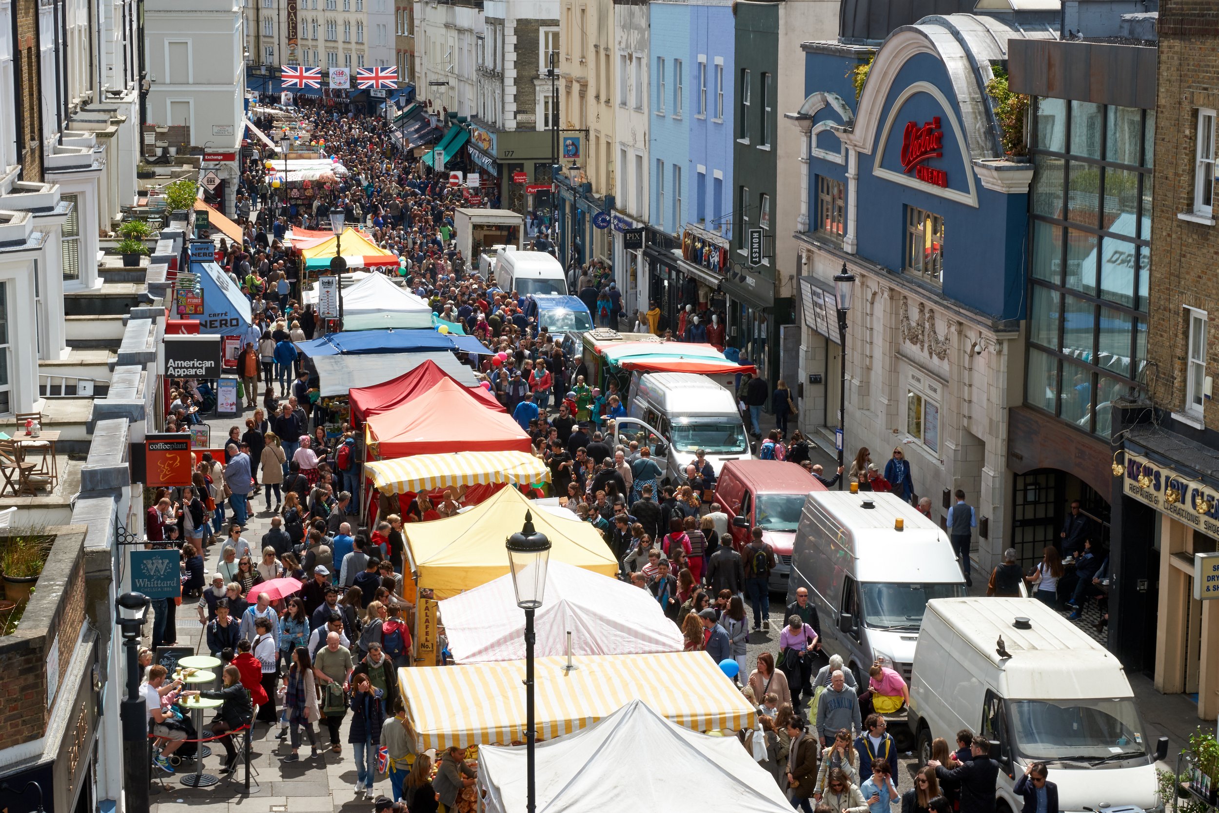 بازار کمدن در شمال لندن، با حالوهوای بوهمی و بیش از ۱۰۰۰ غرفه، یکی از پرطرفدارترین بازارهای خیابانی جهان است. این بازار برای خریدهای خلاقانه و تجربههای فرهنگی بینظیر است.