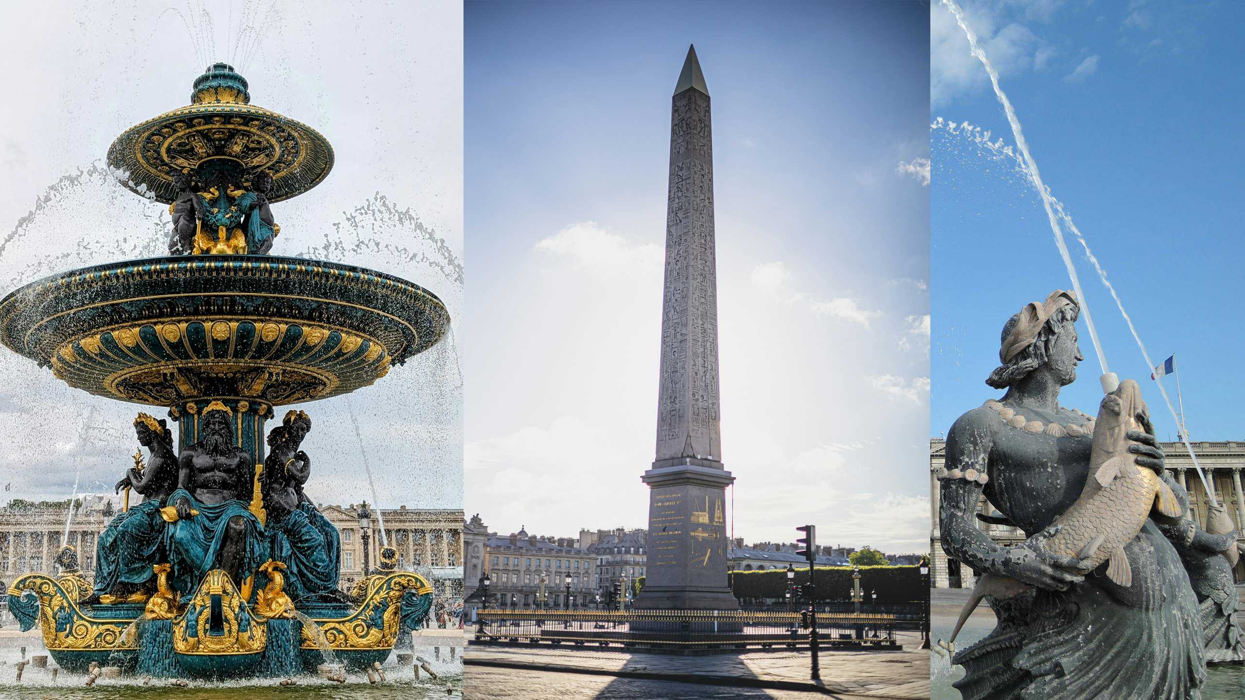 دو فواره باشکوه، طراحیشده توسط ژاک ایگناس هیتورف در سال ۱۸۴۰، در دو طرف ابلیسک قرار دارند. فواره شمالی به رودخانهها و فواره جنوبی به دریاها و اقیانوسها اختصاص دارد. این فوارهها با مجسمههای طلاکاریشده و نورپردازی شبانه، جلوهای خیرهکننده به میدان میبخشند.