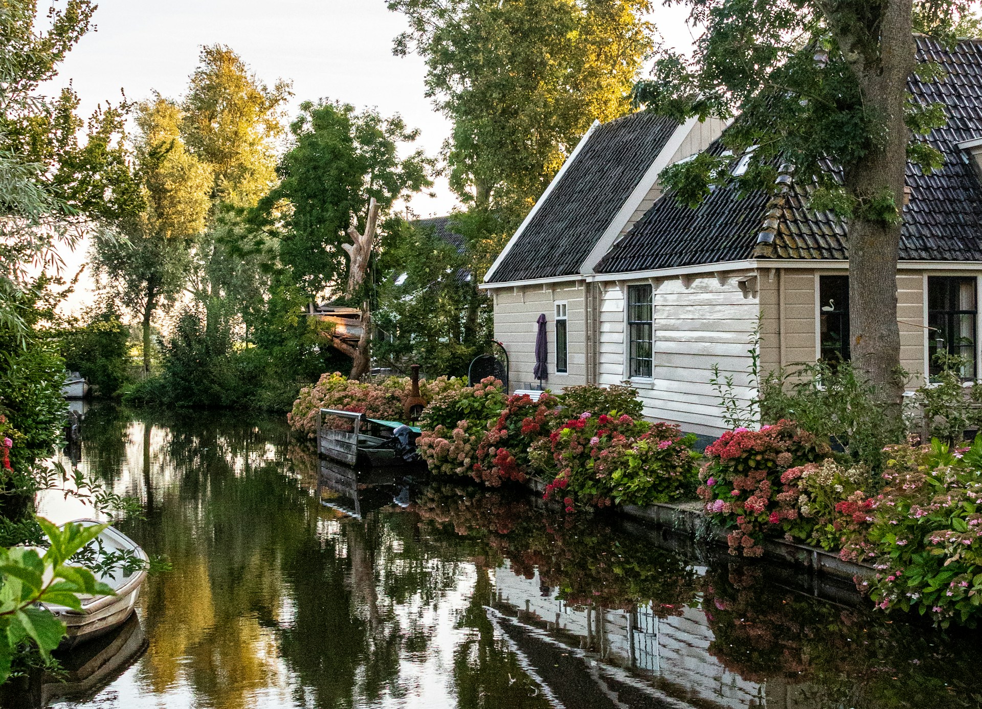 - توصیف بصری: خانههای چوبی رنگارنگ با رنگهای سبز، خاکستری و آبی که در کنار کانالهای آرام قرار دارند. باغهای کوچک پر از گلهای لاله و سنبل، و پلهای چوبی که مناظری کارتپستالی خلق میکنند.