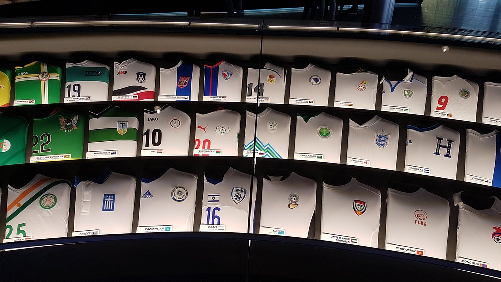 این نمایشگاه شامل یک ویترین ۳۵ متری از پیراهنهای تیمهای ملی ۲۱۱ کشور عضو فیفا است که به ترتیب رنگهای رنگینکمان چیده شدهاند. این بخش نمادی از اتحاد جهانی از طریق فوتبال است. نکته جالب: پیراهن تیم ملی ایران در میان پیراهنهای قرمز قرار دارد، اگرچه معمولاً سفید است! این نمایشگاه برای عکاسی بسیار محبوب است.